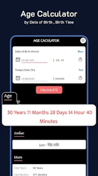 あなたの年齢を知りたいですか?まあ、それは簡単です。この驚くべき年齢計算アプリを使用するだけで、現在の年、月、日、時間、場所の正確な年齢を取得できます。非常にシンプルで使いやすいアプリケーションなので、スキルや知識は必要ありません。生年月日と現在の日時を入力するだけで、現在の年、月、日、時刻の正確な年齢がわかります。これは、あなたの人生に大いに役立つ非常に便利なアプリです。